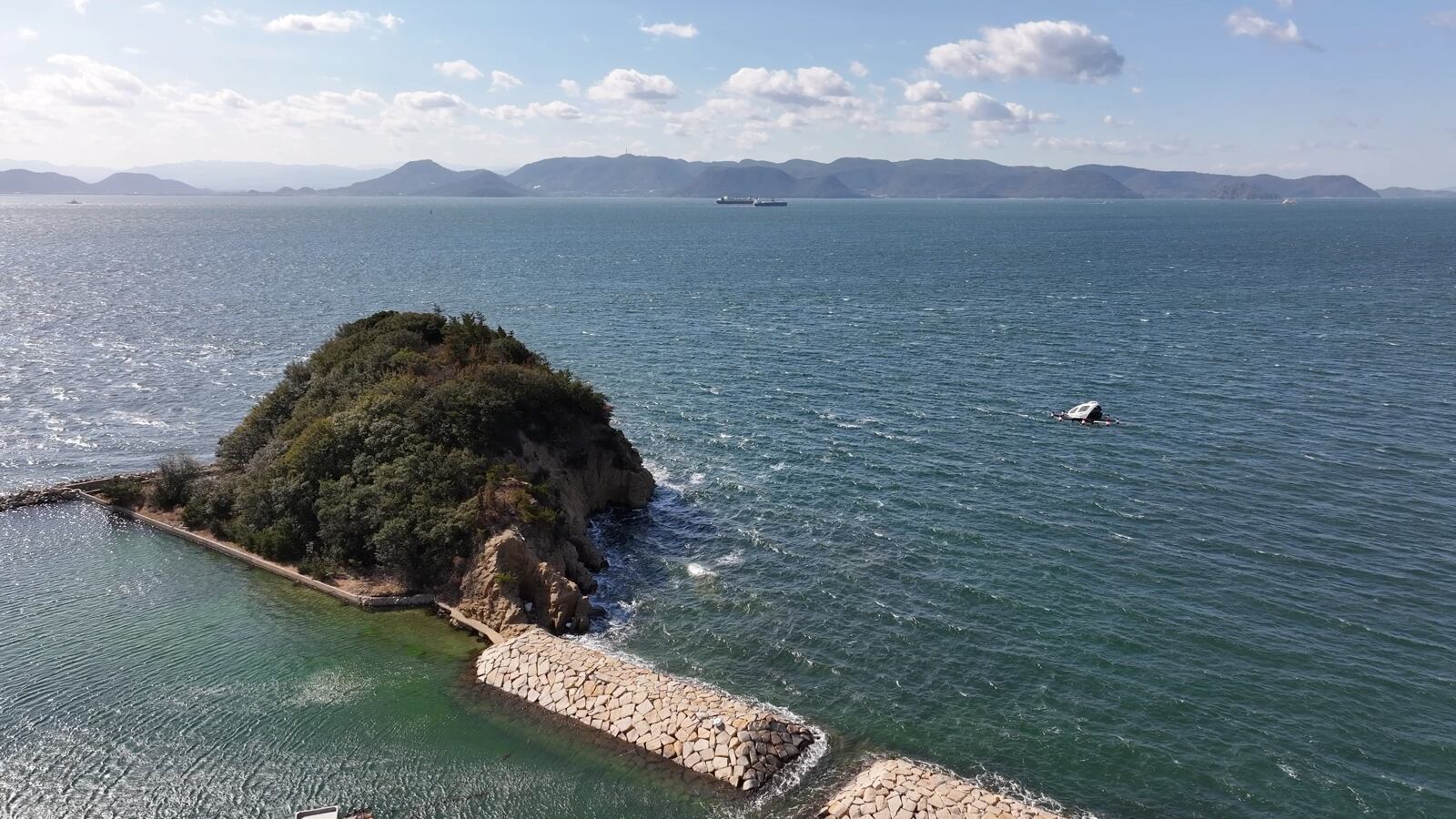 瀬戸内の風景が中心でその中に空飛ぶクルマEhang216sga少し小さいですが